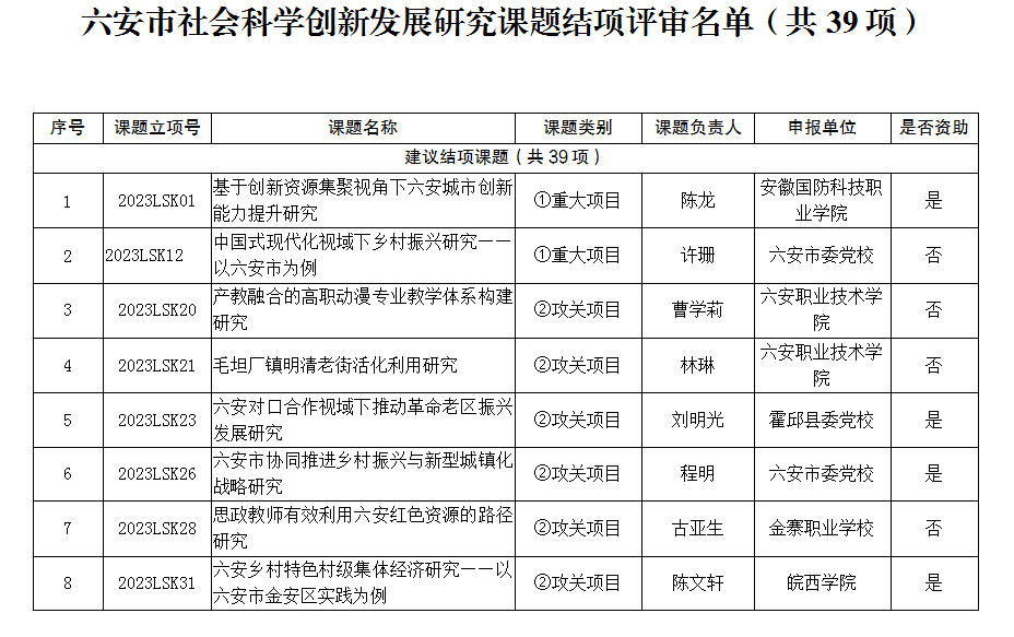根据《六安市社会科学创新发展研究课题管理办法》要求和市社科联年度工作安排,市社科联组织开展了2025年度六安市社会科学创新发展研究课题结项评审工作。经专家组评定,建议结项课题共39项。名单如下: